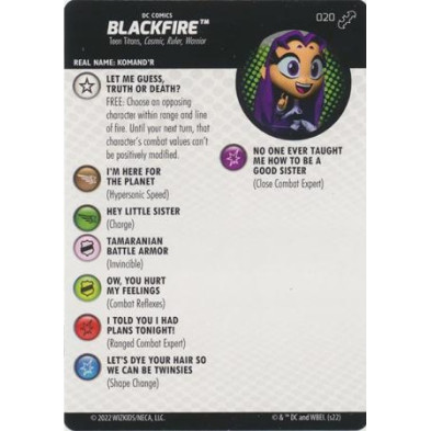 Figura de Heroclix Blackfire 020. Incluye carta de personaje en inglés.
