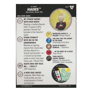 Figura de Heroclix Hades 057. Incluye carta de personaje en inglés.