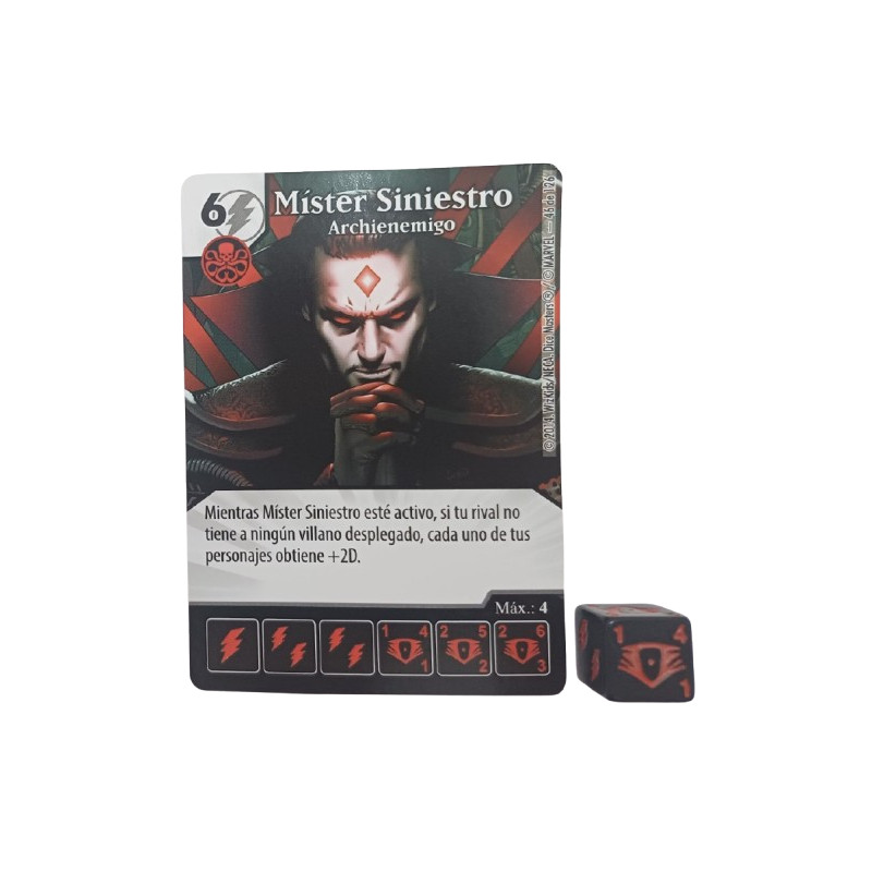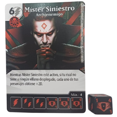 Tarjeta de Dice Masters Míster Siniestro (Archienemigo) 046. Incluye dado exclusivo y carta de personaje en español.