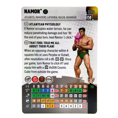 Figura de Heroclix Namor 037a + Cosmic Cube s006. Incluye la carta de personaje en inglés.