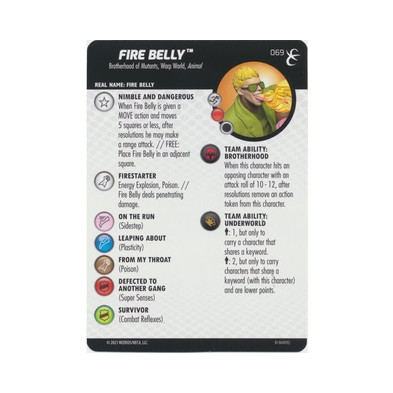 Figura de Heroclix Fire Belly 069. Incluye la carta de personaje en inglés.